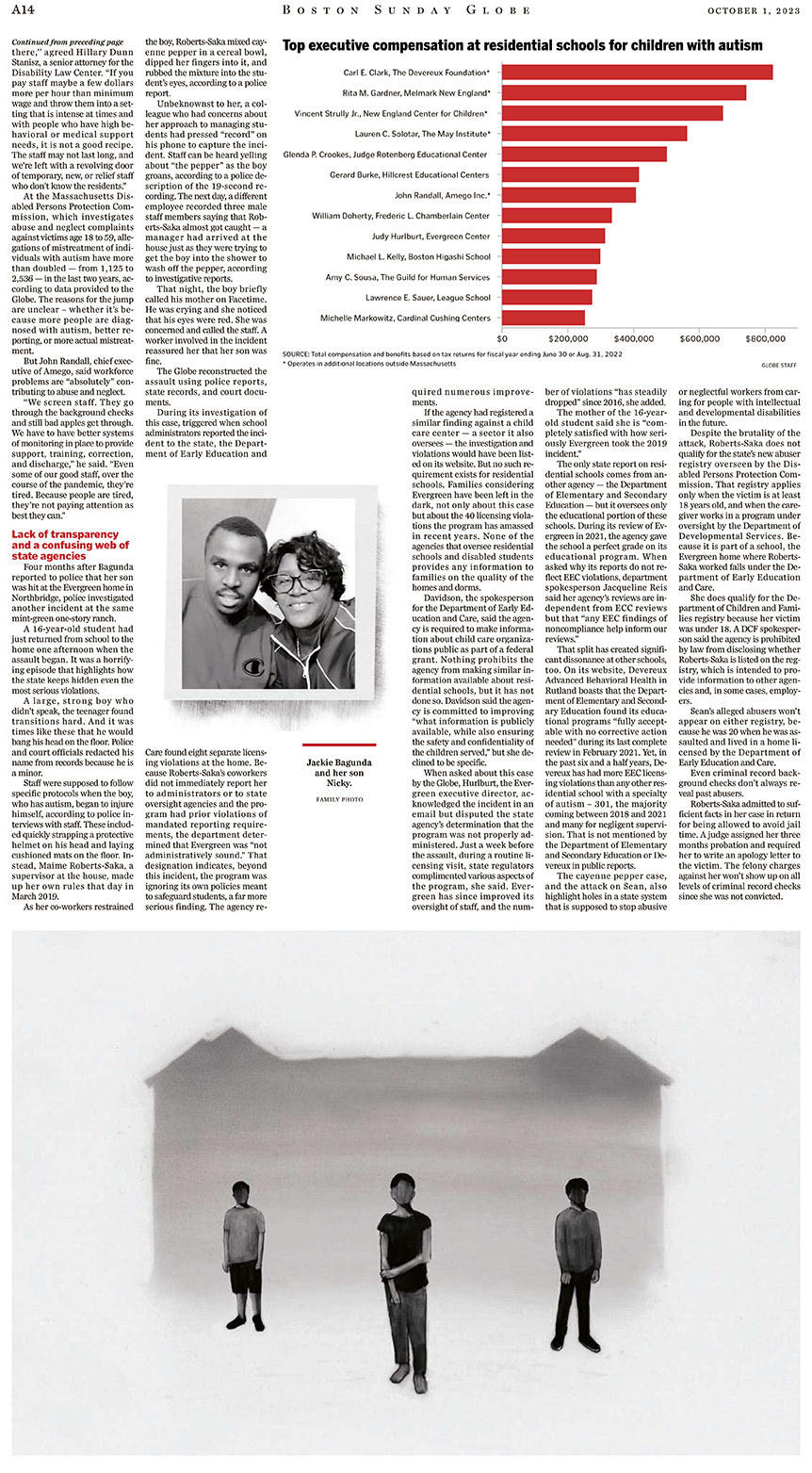 I drew 5 illustrations for an article in The Boston Globe about abuse and neglect in the state-licensed residential schools for children with severe autism.